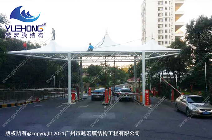 膜結構遮陽棚應用范圍比較廣,常用于是門廊遮陽棚、或者出入口頂棚,解決了車輛出入的秩序、遮陽遮雨遮風的問題。并且完美融合了小區的建筑風格,長期暴曬都仍能保持色彩鮮艷 更神奇的是防紫外線功能特別好,能保障了某個區域良好環境,膜材透光率保持10%-15%, 美好的柔光白天引入減少照明能耗。降低所需消耗的成本。